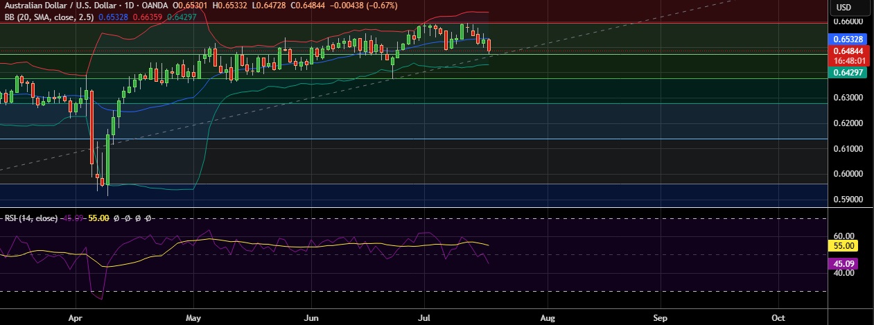 • Support is seen at 0.6471(50%fib) and break below could take the pair towards 0.6427(Lower BB).