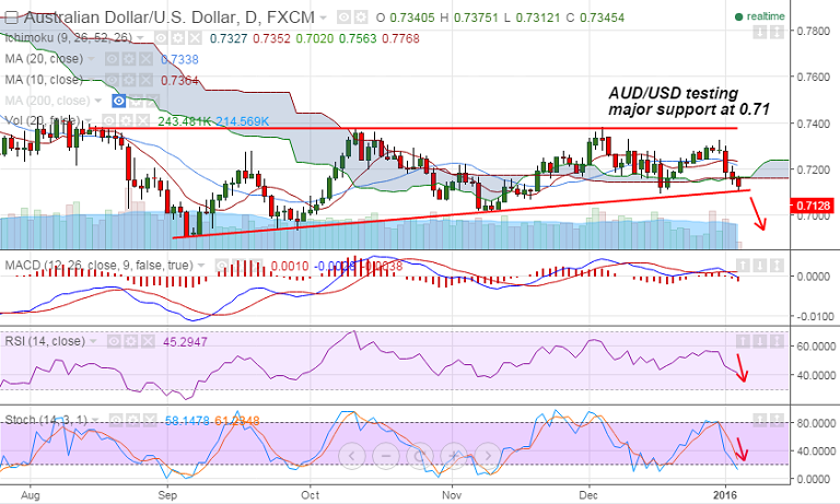 - AUD/USD is testing major support at 0.71 levels, break below could see 0.7068 and then 0.7016 levels.