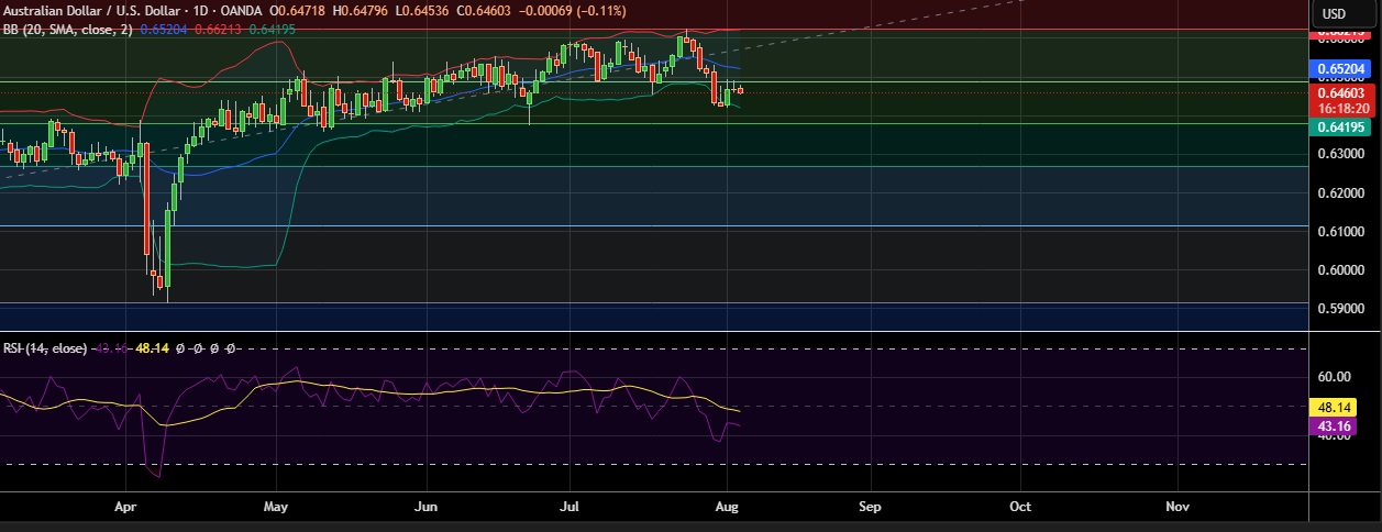 • Support is seen at 0.6422(Lower BB) and break below could take the pair towards 0.6378(50%fib B).