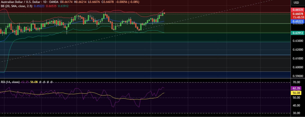 • Immediate resistance is located at 0.6622(23.6%fib), any close above will push the pair towards 0.6659(Higher BB)