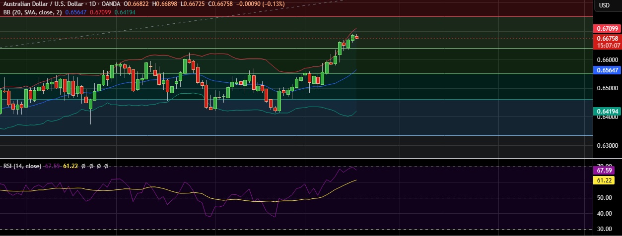 • Immediate resistance is located at 0.6707(Higher BB), any close above will push the pair towards 0.6755(23.6%fib)