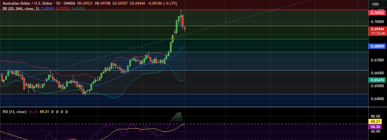 • Immediate resistance is located at 0.6967(38.2%fib), any close above will push the pair towards 0.7054(Higher BB).