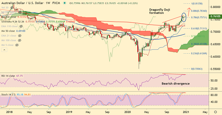 The pair was trading 0.22% higher on the day at 0.7610 at around 04:20 GMT, after closing 0.27% higher on 24th trade.