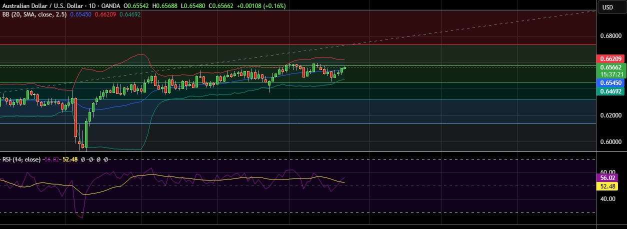 • Immediate resistance is located at 0.6575(38.2%fib), any close above will push the pair towards 0.6624(Higher BB )