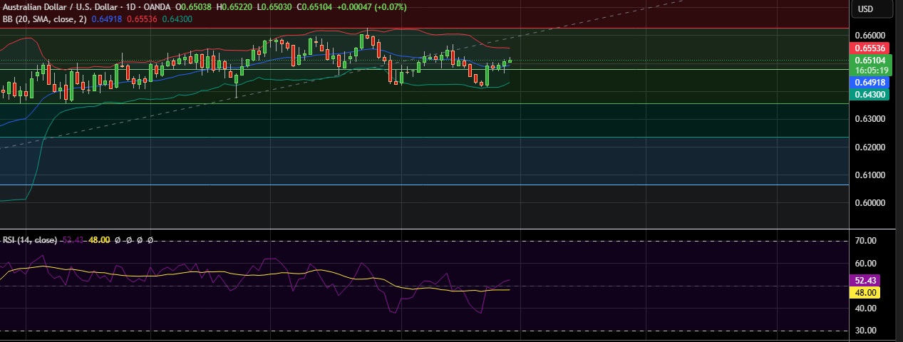 • Immediate resistance is located at 0.6554(Higher BB), any close above will push the pair towards 0.6626(23.6%fib)