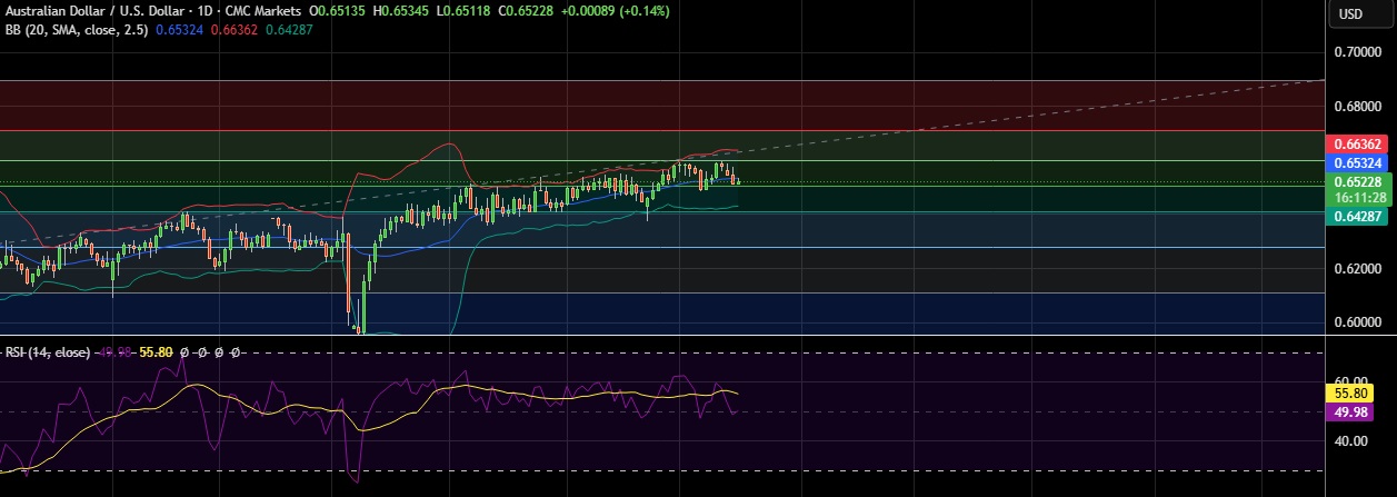 • Support is seen at 0.6504(50%fib) and break below could take the pair towards 0.6430(Lower BB).