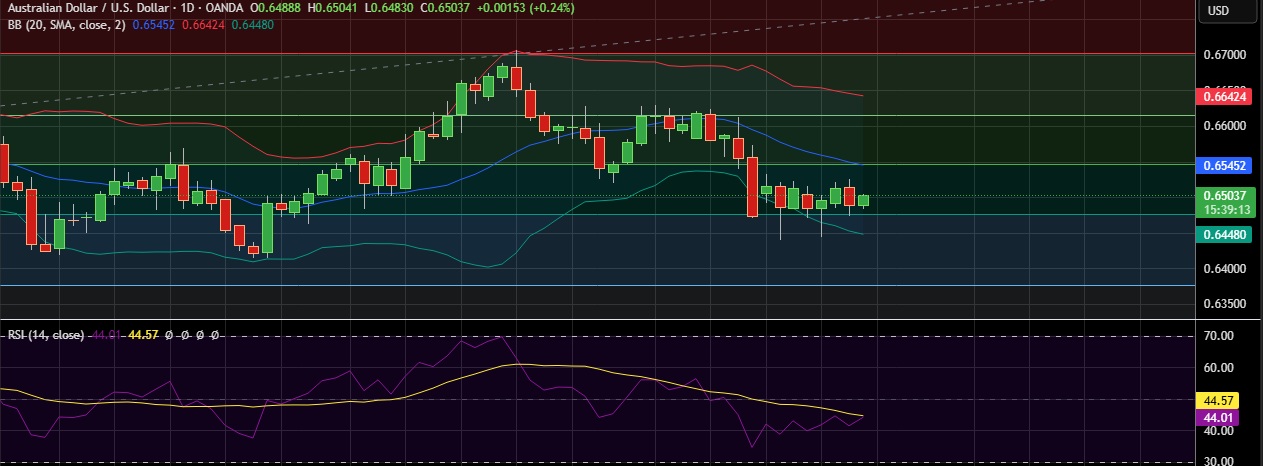 • Support is seen at 0.6476(61.8%fib) and break below could take the pair towards 0.6448(Lower BB).
