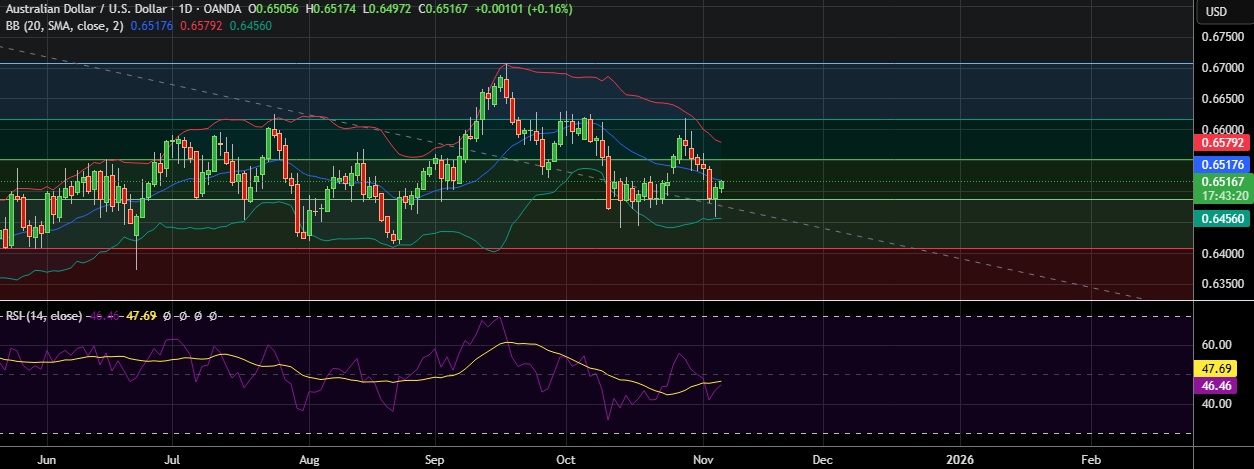 • Support is seen at 0.6489 (50%fib) and break below could take the pair towards 0.6456(Lower BB).