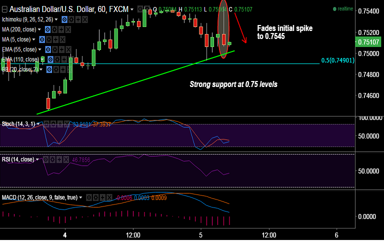 - Break below 0.75 could drag the pair to 0.7440 (20-DMA), break below could then see test of 0.7350 (trendline). On the upside break above 0.7545 could see gains upto 0.7575