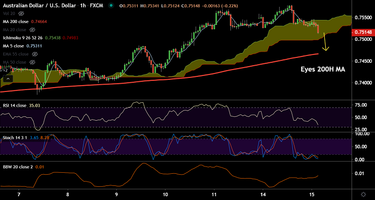 AUD/USD was trading 0.12% lower at 0.7523 at 03:30 GMT, minor weakness on charts.