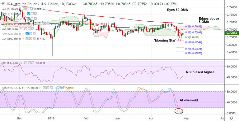 - Price action has edged above 5-DMA and we see scope for upside till 50-DMA at 0.71.
