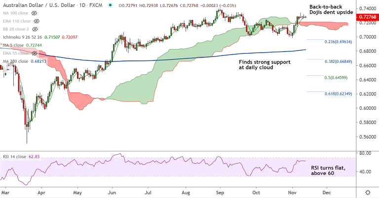 The pair finds strong support at daily cloud at 0.7209. Break below cloud will see downside resumption.