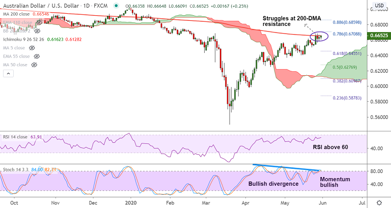 Price action is above cloud, volatility is rising and momentum studies are bullish. The pair faces tough barrier at 200-DMA and break above 0.67 mark will propel prices higher.