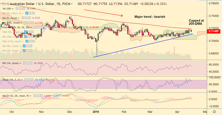 Strong support seen at 0.7140. Decisive break below will see weakness till 0.7117 (cloud top and 20-DMA) and then 0.7087 (Apr 8 low).