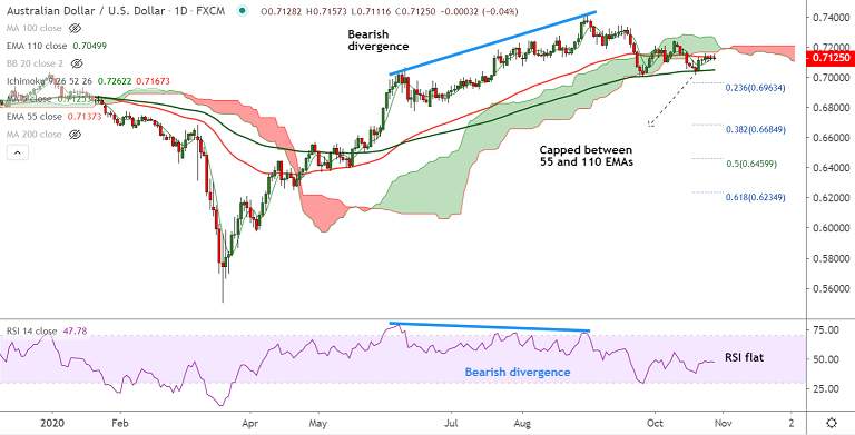 Risk-aversion amid fresh lockdowns likely to be imposed in France and Germany keep the Aussie under pressure. Upbeat Australian Q3 CPI data fails to offer any respite.