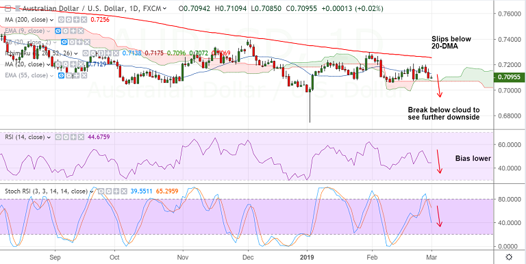 - Below daily cloud, we see little support till lower Bollinger Band at 0.7037.