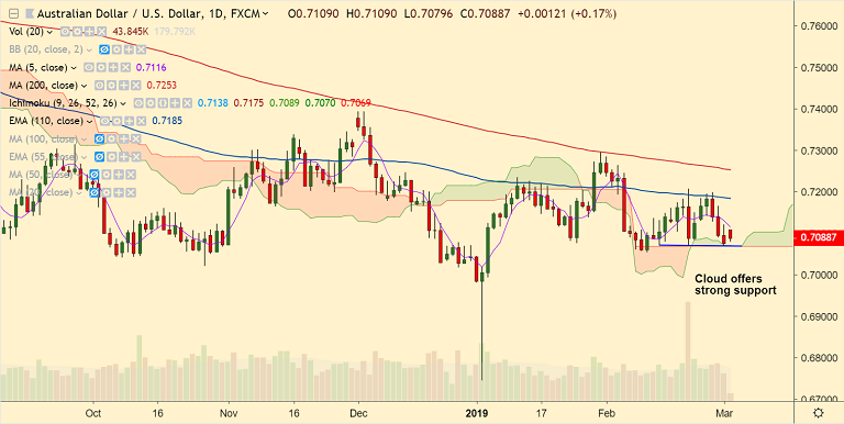 Support levels - 0.7070 (trendline and cloud), 0.7037 (Lower BB), 0.7021 (Oct 26 low)