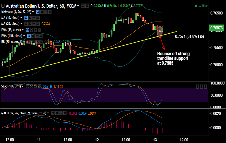- We see strong trendline support at 0.7585 levels, further weakness only on break below.
