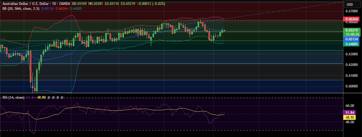 • Immediate resistance is located at 0.6616(38.2%fib), any close above will push the pair towards 0.6629(Higher BB)