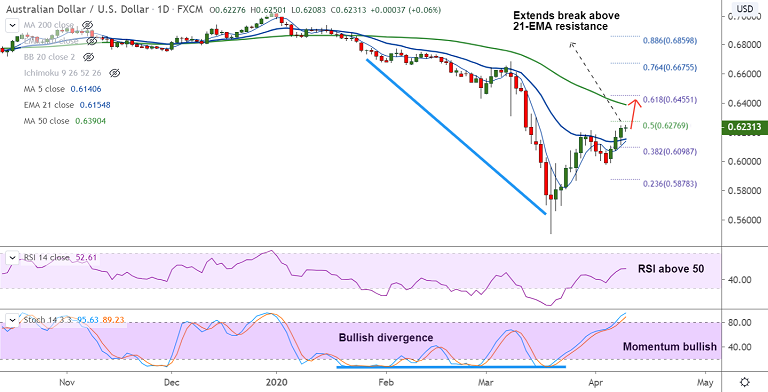 Aussie erased losses on Wednesday's trade and surged past the 0.62 handle, extending break above 21-EMA.
