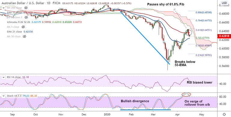 Next major support lies at 21-EMA at 0.6235 ahead of 20-DMA at 0.6139. Focus on U.S. jobless claims for further impetus.