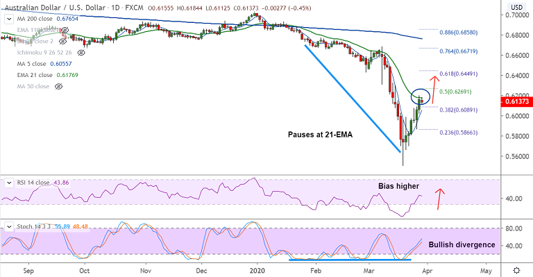 The pair currently finds stiff resistance at 21-EMA at 0.6177. Break above could see further upside. Next immediate hurdle aligns at 50% Fib at 0.6269 ahead of 61.8% Fib at 0.6450.