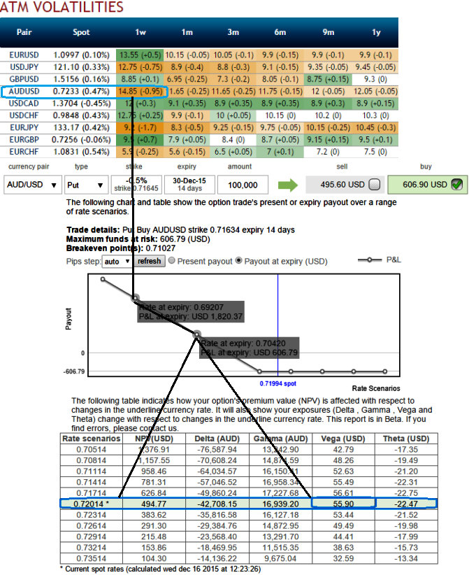 In this instance, let's suppose in 2 days' time AUDUSD moves to 0.7280 from current levels of 0.7205 (75 pips i.e 1%) calls that we've written here would be at the money.