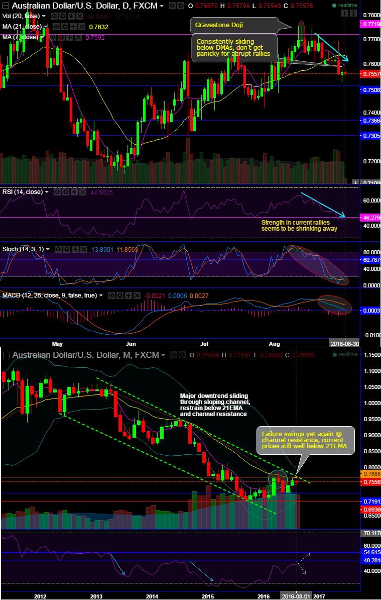 The failure swings at major resistance 0.7719 have collapsed to the current levels of 0.7556 (Consistently falling below DMAs in the recent past).