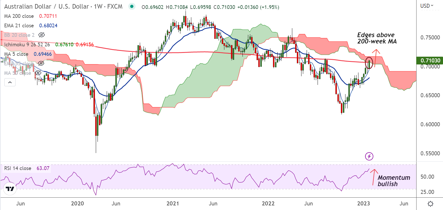 AUD/USD hit a 5-month high of 0.7108, edged above major resistance at 200-week MA. A decisive close above 200-week MA will fuel further gains in the pair.