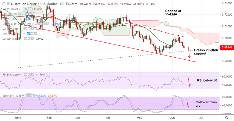 AUD/USD breaks below 20-DMA support, hits new 2-week lows at 0.6910.
