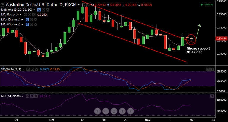 - Strong support for the pair is located at 0.7090 (5 DMA, Trendline support), breaks below could take the pair to next support (Double bottom) at 0.7067.