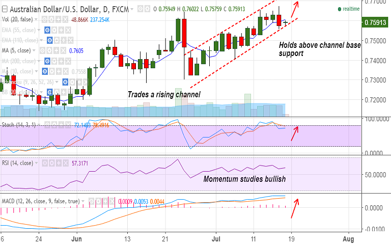 - The pair is trading a rising channel and price action has bounced of channel base support at 0.7575.