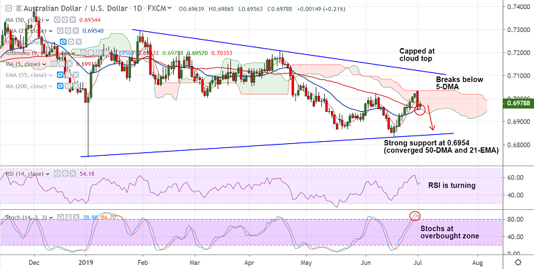 The pair finds strong support at 0.6954 (converged 50-DMA and 21-EMA). Break below will see resumption of downside.