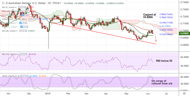 Major trend is bearish and upside has been rejected at 55-EMA. 5-DMA has turned and is immediate resistance at 0.6972.