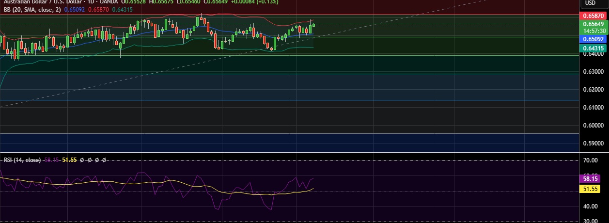 • Immediate resistance is located at 0.6590(Higher BB), any close above will push the pair towards 0.6619(23.6%fib)