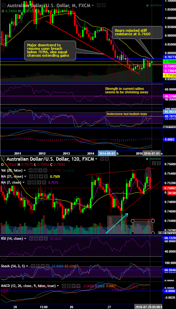 AUD/USD has been failing quite often to break resistance at 21DMA from the last couple of months (see monthly charts), as a result, we think since it doesn't manage to break above decisively on a closing which would likely create more bearish potential in days to come.
