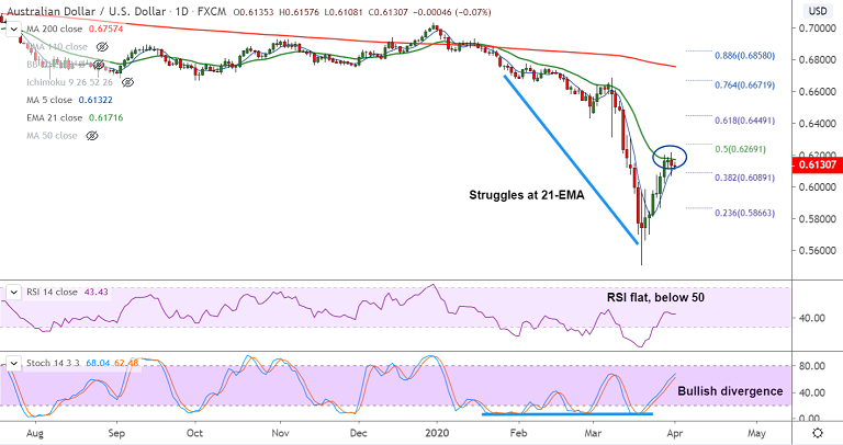 Decisive breakout at 21-EMA could see some upside continuation. Next major hurdle lies at 50% Fib at 0.6269.