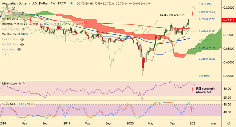 AUD/USD was trading 0.12% higher on the day at 0.7540 at around 05:00 GMT, after closing 0.02% lower in the previous session.