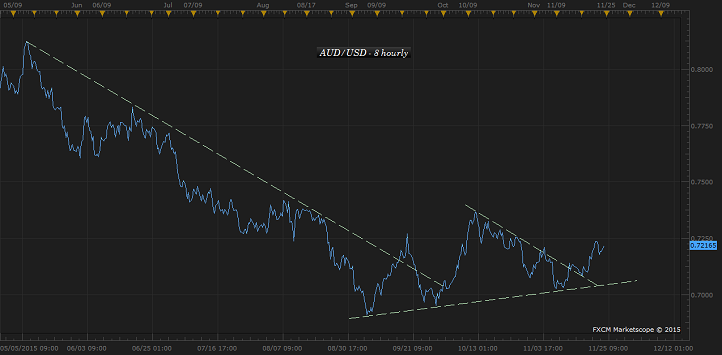 Reserve Bank of Australia (RBA) is likely to hold rates for the time being, which can extend beyond first quarter of 2016 and unless further weakness in demand from China. With that outlook on the rate front, Aussie is nice leg to hold for may short term traders to play out policy divergence heading into European Central Bank's (ECB) policy meeting next week.