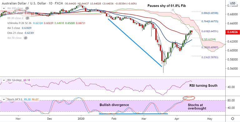 Summary: Signs of upside exhaustion in the pair. Focus on US consumer spending and Australian jobs report. Watch out for break below 55-EMA for weakness.
