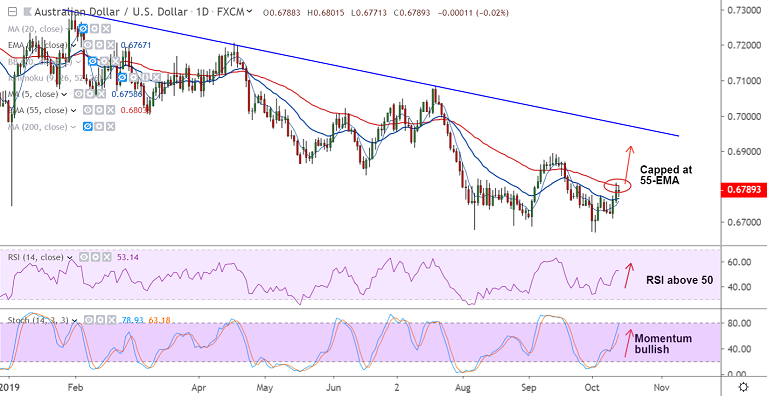 Next hurdle on the upside lies at 110-EMA at 0.6867, while 21-EMA is strong support on the downside at 0.6767.