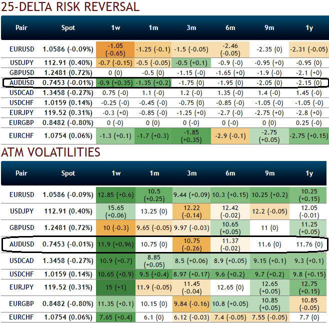 Let’s just have a glance over OTC sentiments of AUD’s ATM contracts, from positive risk reversal flashes you can possibly make out hedging functions for short term upside risks in the underlying spot FX of AUDUSD and but bearish risk sentiments in long run remains intact, while the spike in 1w IV skews also signifies the hedging interests for upside risks.