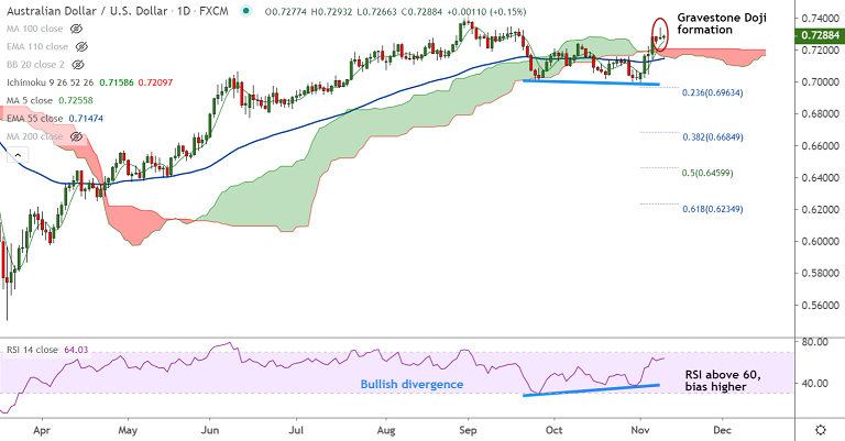 AUD/USD was trading 0.16% higher on the day at 0.7289 at around 09:15 GMT, bias remains bullish.