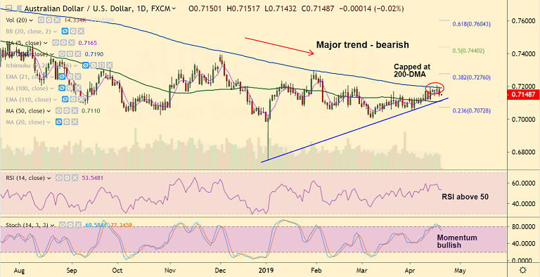 - Scope for test of trendline support at 0.7110 (nearly converged 50-DMA and trendline). Break below opens up further downside.