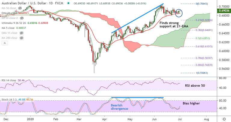 Price action holds above 21-EMA support, weakness only on break below. Momentum is bullish. Bounce off 21-EMA will see upside resumption.