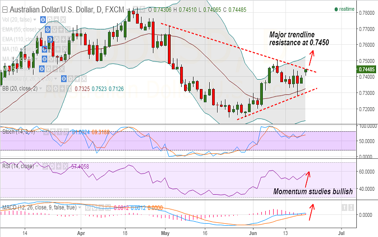 - Upside finds major trendline resistance at 0.7450 levels, break above will see test of 0.75 and then 0.7560 levels.