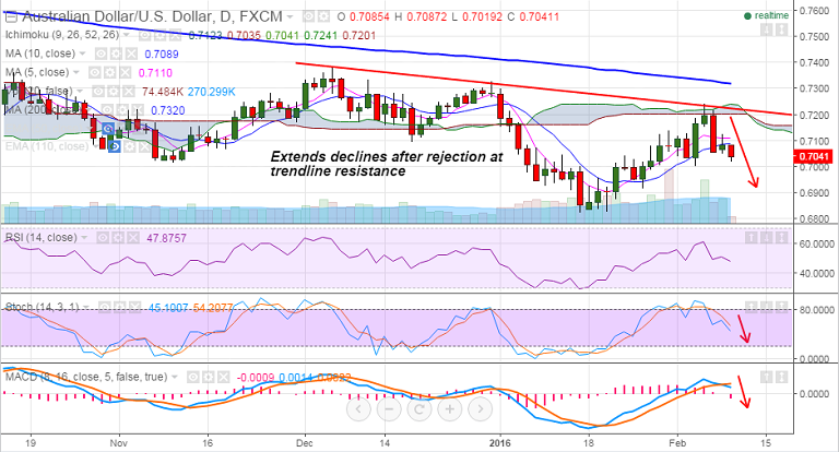 - 5-DMA at 0.7089 is strong resistance on the upside, while 0.70 (psychological level and Feb 3rd lows) is next immediate support on the downside.