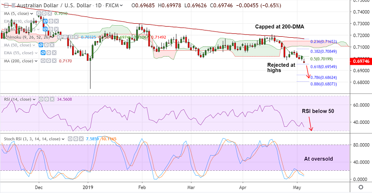 - Next bear target lies at 61.8% Fib at 0.6955 and then 0.6862 (78.6% Fib). 5-DMA is immediate resistance at 0.7011. Break above could see gains upto 0.7065.
