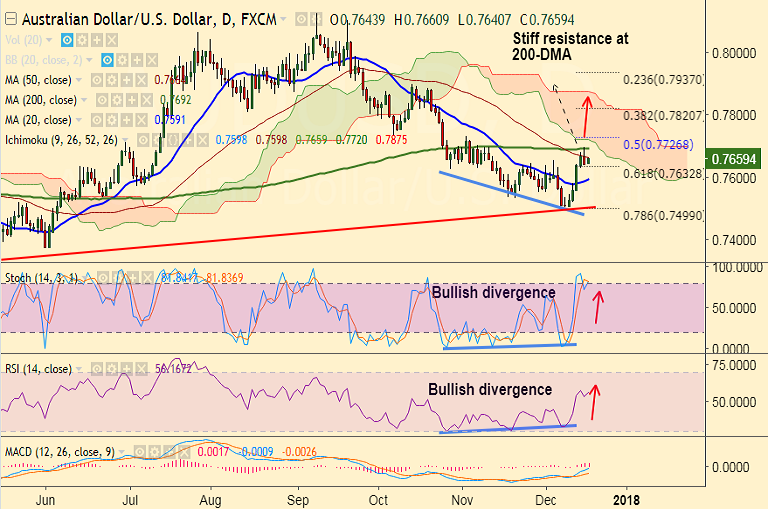 Resistance levels - 0.7664 (50-DMA), 0.7692 (200-DMA), 0.7726 (50% Fib retrace of 0.73285 to 0.81250 rally)