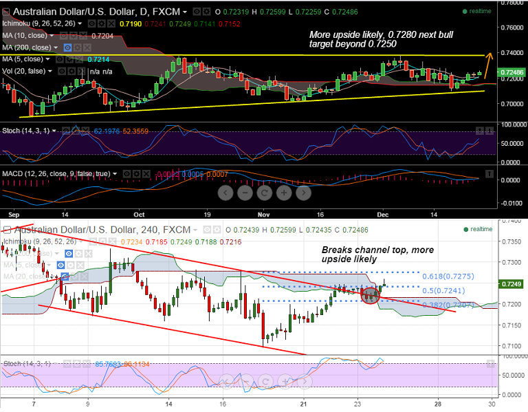 - On the Technical side, we see a bullish 5&10 DMA crossover, the pair has broken channel top resistance at 0.7220 in yesterday's trade, Stochs are in neutral territory and point north.